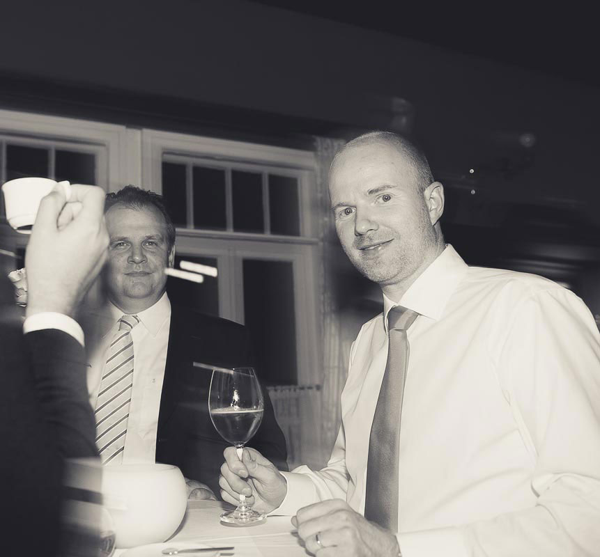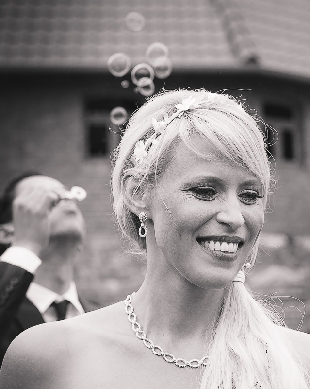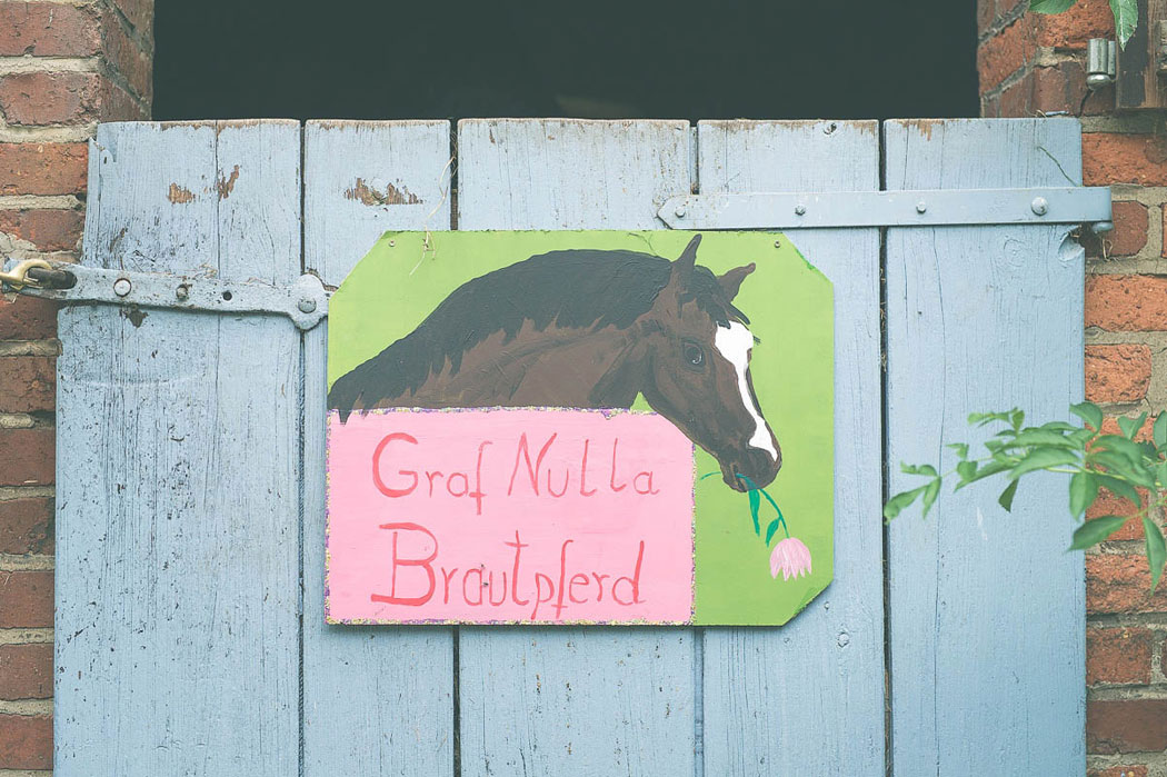 Die Braut wurde den kurzen Weg zur Kirche geführt, der Labrador Paul brachte die Ringe zum Tausch und beim anschließenden Sektempfang auf dem Hof durften Hund, Katze und Pferde teilnehmen und bereicherten die kleine Party nicht nur optisch. Anschließend ging’s, dann doch motorisiert, in den Nachbarort ans Buffet. Der Brautstrauß wurde geworfen, auch gefangen. Die Hochzeitstorte wurde verteilt, es wurde lange getanzt und bei der Reise nach Jerusalem gab es einen Sieger wie es sich gehört.
